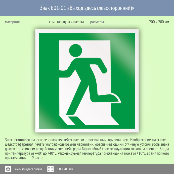 Знак E01-01 «Выход здесь (левосторонний)» (пленка, 200х200 мм) в Бердске купить