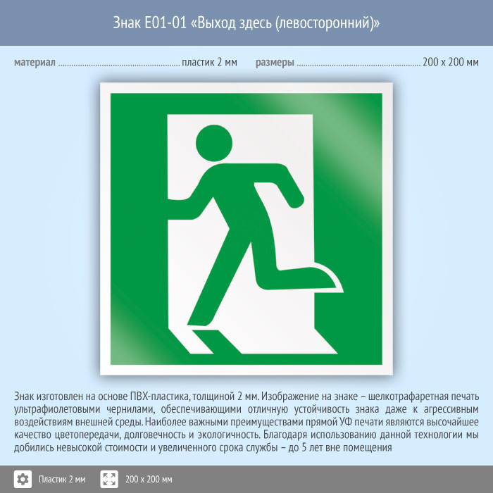 Знак E01-01 «Выход здесь (левосторонний)» (пластик, 200х200 мм) в Бердске купить