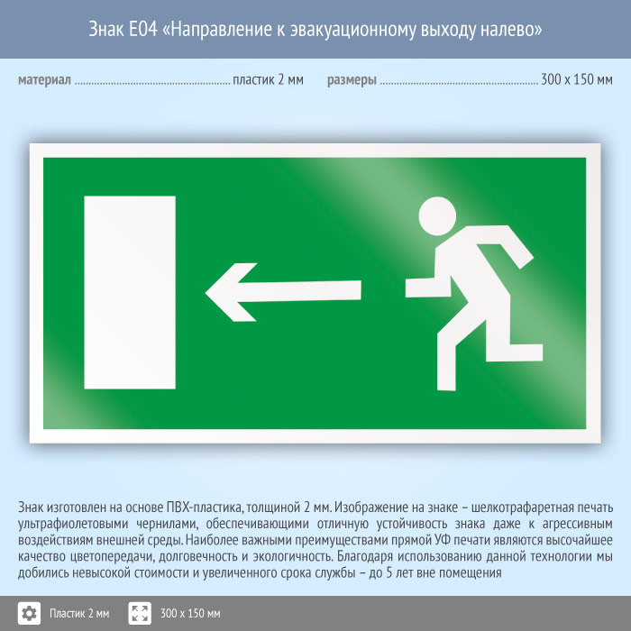 Знак E04 «Направление к эвакуационному выходу налево» (пластик, 300х150 мм) в Бердске купить