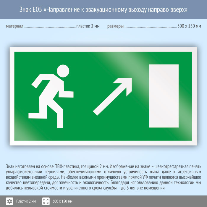 Знак E05 «Направление к эвакуационному выходу направо вверх» (пластик, 300х150 мм) в Бердске купить
