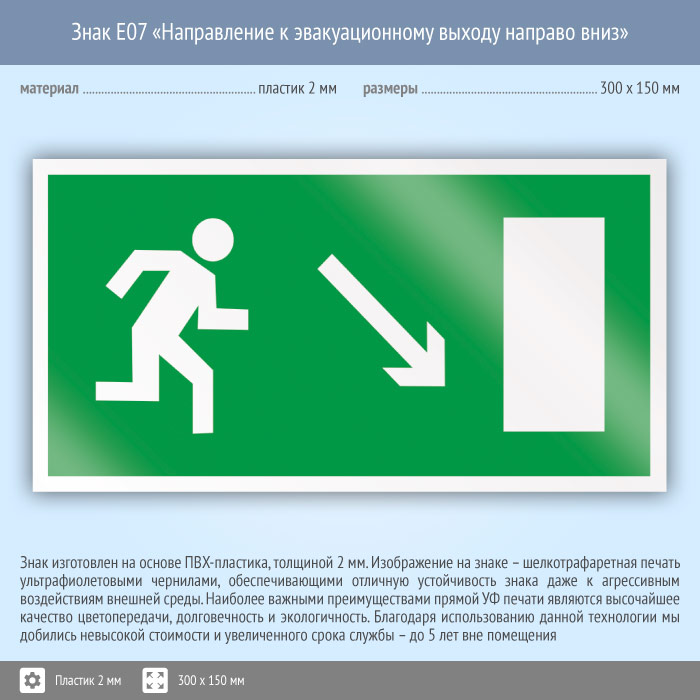 Знак E07 «Направление к эвакуационному выходу направо вниз» (пластик, 300х150 мм) в Бердске купить