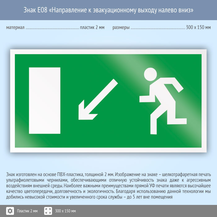 Знак E08 «Направление к эвакуационному выходу налево вниз» (пластик, 300х150 мм) в Бердске купить