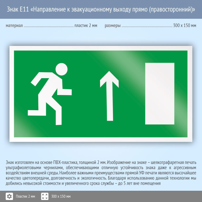 Знак E11 «Направление к эвакуационному выходу прямо (правосторонний)» (пластик, 300х150 мм) в Бердске купить
