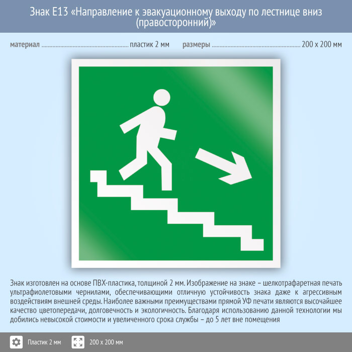 Знак E13 «Направление к эвакуационному выходу по лестнице вниз (правосторонний)» (пластик, 200х200 мм) в Бердске купить