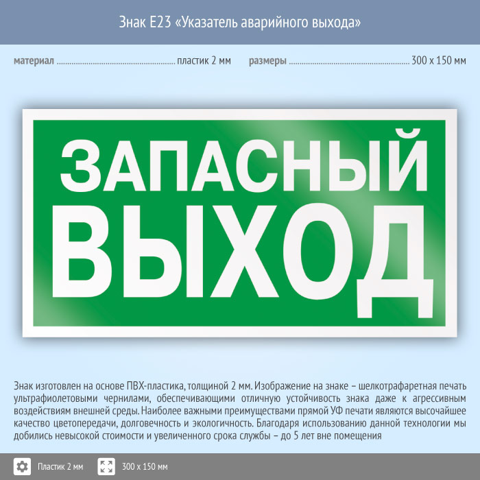 Знак E23 «Указатель запасного выхода» (устаревший) (пластик, 300х150 мм) в Бердске купить