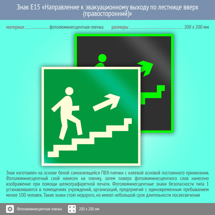 Знак E15 «Направление к эвакуационному выходу по лестнице вверх (правосторонний)» (фотолюминесцентная пленка, 200х200 мм) в Бердске купить