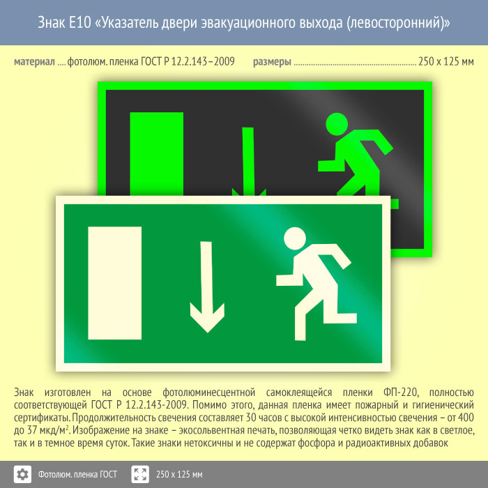 Знак E10 «Указатель двери эвакуационного выхода (левосторонний)» (фотолюминесцентная пленка ГОСТ 34428-2018, 250х125 мм) в Бердске купить