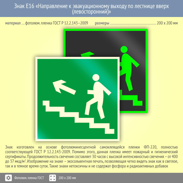 Знак E16 «Направление к эвакуационному выходу по лестнице вверх (левосторонний)» (фотолюминесцентная пленка ГОСТ 34428-2018, 200х200 мм) в Бердске купить