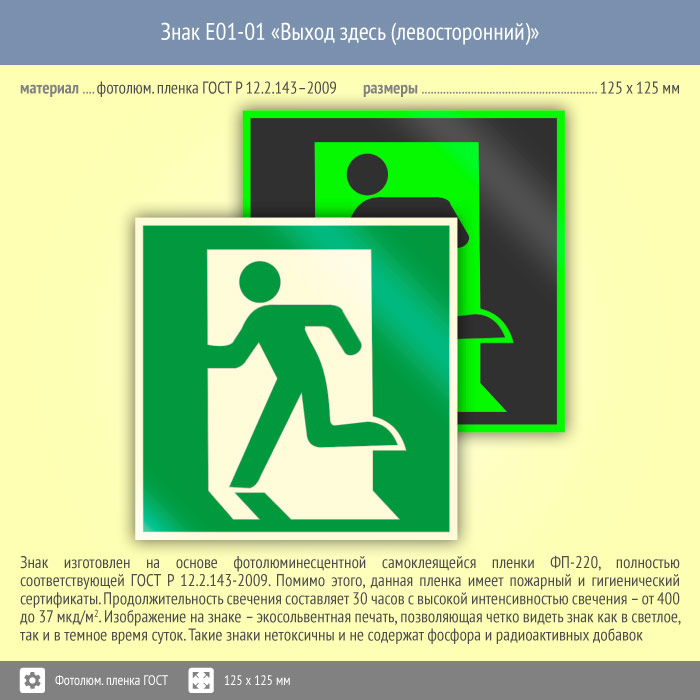Знак E01-01 «Выход здесь (левосторонний)» (фотолюминесцентная пленка ГОСТ 34428-2018, 125х125 мм) в Бердске купить