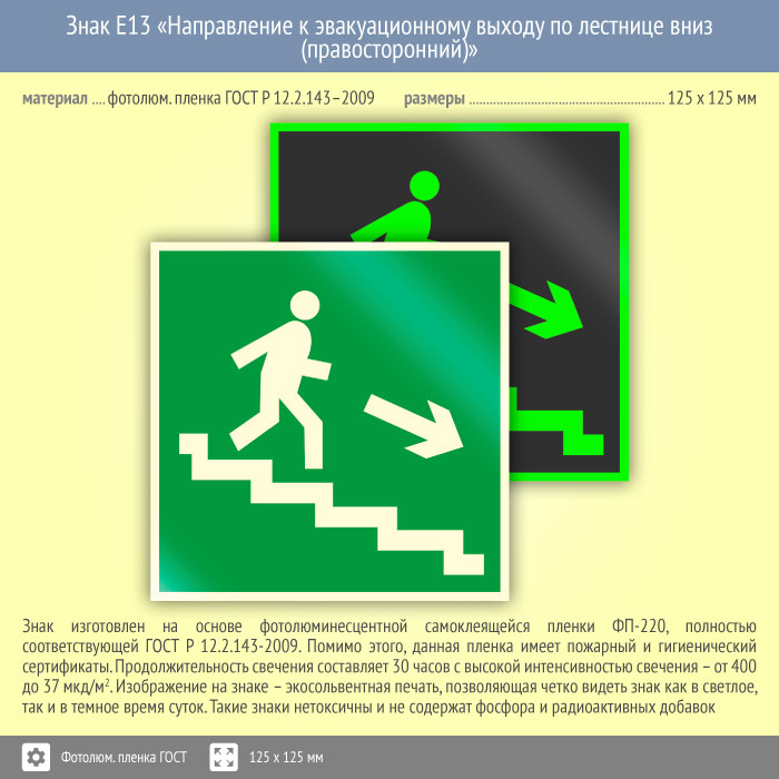 Знак E13 «Направление к эвакуационному выходу по лестнице вниз (правосторонний)» (фотолюминесцентная пленка ГОСТ 34428-2018, 125х125 мм) в Бердске купить