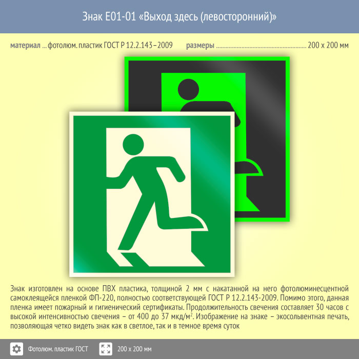 Знак E01-01 «Выход здесь (левосторонний)» (фотолюминесцентный пластик ГОСТ 34428-2018, 200х200 мм) в Бердске купить
