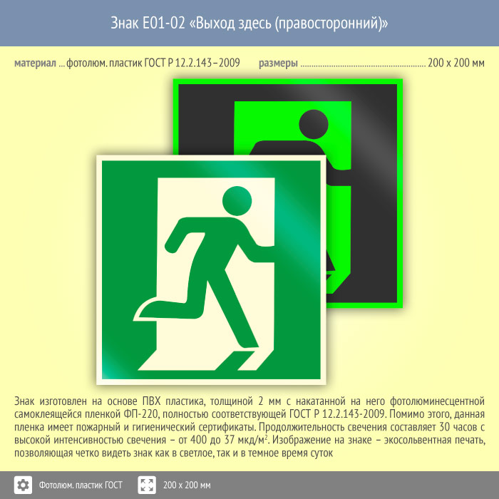 Знак E01-02 «Выход здесь (правосторонний)» (фотолюминесцентный пластик ГОСТ 34428-2018, 200х200 мм) в Бердске купить