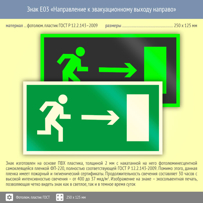 Знак E03 «Направление к эвакуационному выходу направо» (фотолюминесцентный пластик ГОСТ 34428-2018, 250х125 мм) в Бердске купить