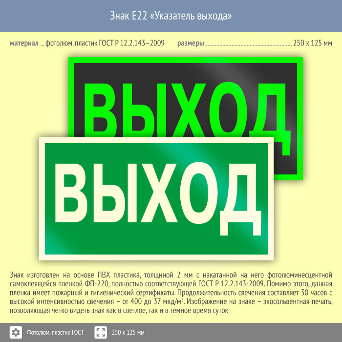Знак E22 «Указатель выхода» (фотолюминесцентный пластик ГОСТ 34428-2018, 250х125 мм) в Бердске купить