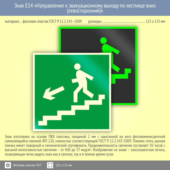 Знак E14 «Направление к эвакуационному выходу по лестнице вниз (левосторонний)» (фотолюминесцентный пластик ГОСТ 34428-2018, 125х125 мм) в Бердске купить