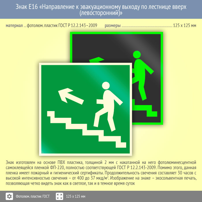 Знак E16 «Направление к эвакуационному выходу по лестнице вверх (левосторонний)» (фотолюминесцентный пластик ГОСТ 34428-2018, 125х125 мм) в Бердске купить
