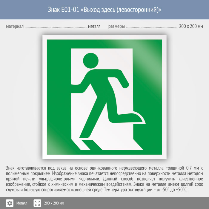Знак E01-01 «Выход здесь (левосторонний)» (металл, 200х200 мм) в Бердске купить