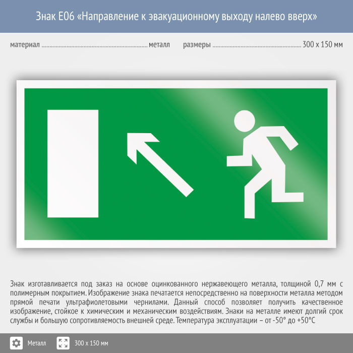 Знак E06 «Направление к эвакуационному выходу налево вверх» (металл, 300х150 мм) в Бердске купить