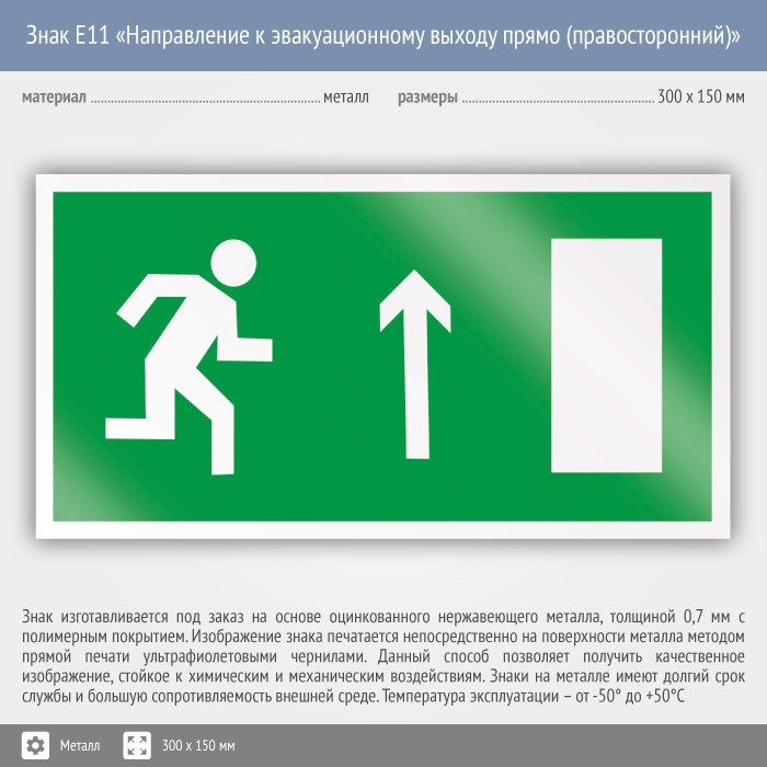 Знак E11 «Направление к эвакуационному выходу прямо (правосторонний)» (металл, 300х150 мм) в Бердске купить