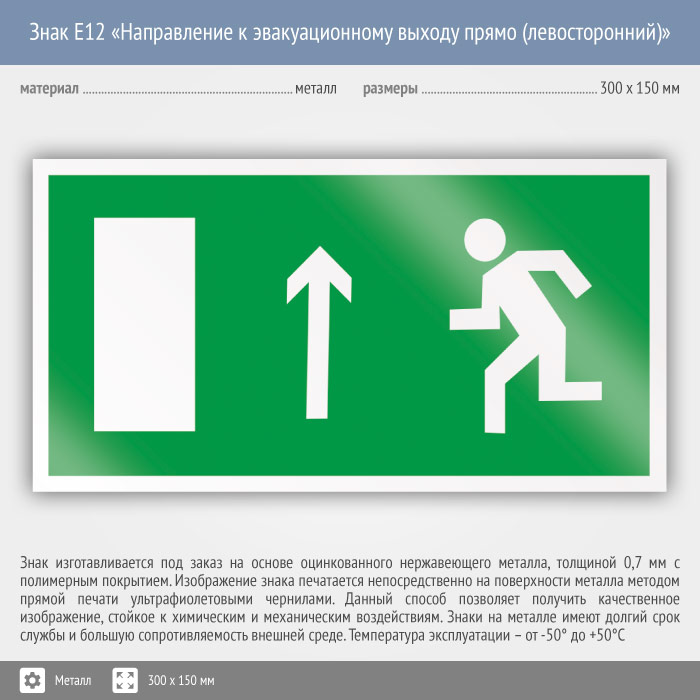 Знак E12 «Направление к эвакуационному выходу прямо (левосторонний)» (металл, 300х150 мм) в Бердске купить