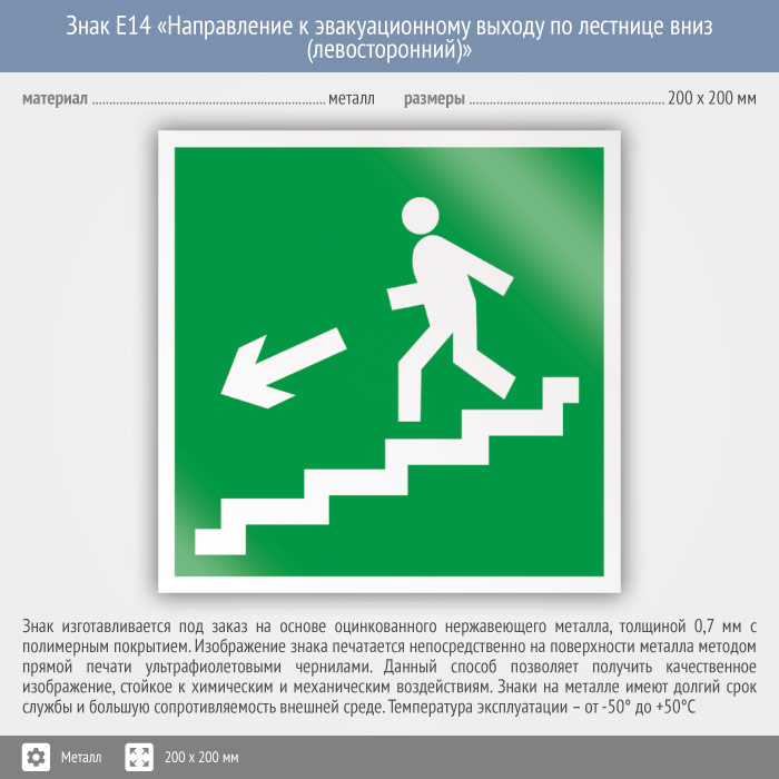 Знак E14 «Направление к эвакуационному выходу по лестнице вниз (левосторонний)» (металл, 200х200 мм) в Бердске купить