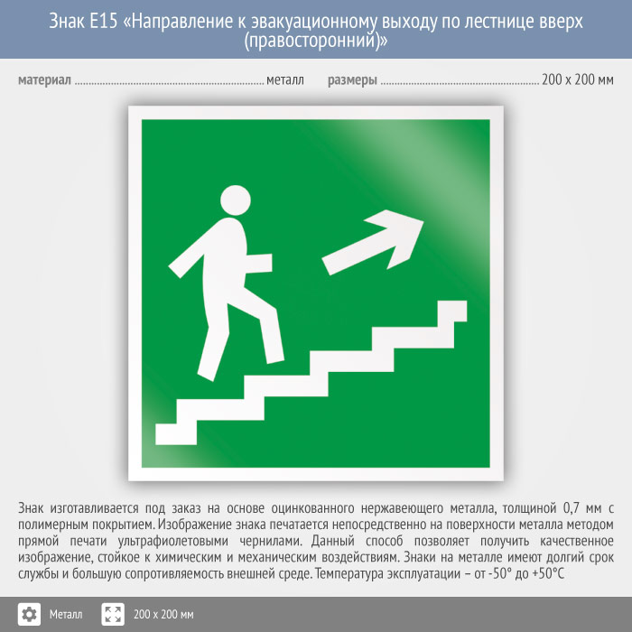 Знак E15 «Направление к эвакуационному выходу по лестнице вверх (правосторонний)» (металл, 200х200 мм) в Бердске купить