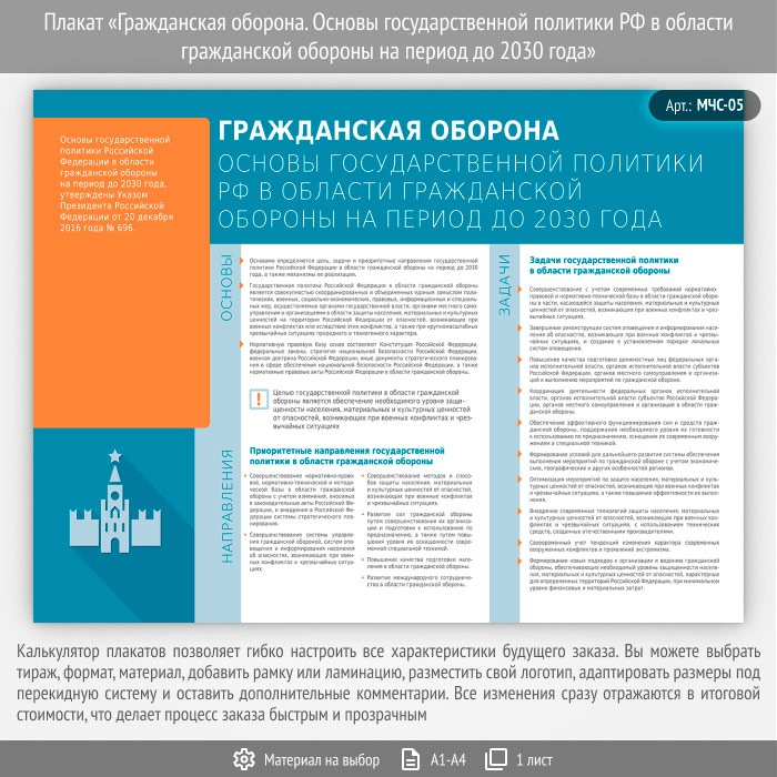 Плакат «Гражданская оборона. Основы государственной политики РФ в области гражданской обороны на период до 2030 года» (МЧС-05, 1 лист) в Бердске купить
