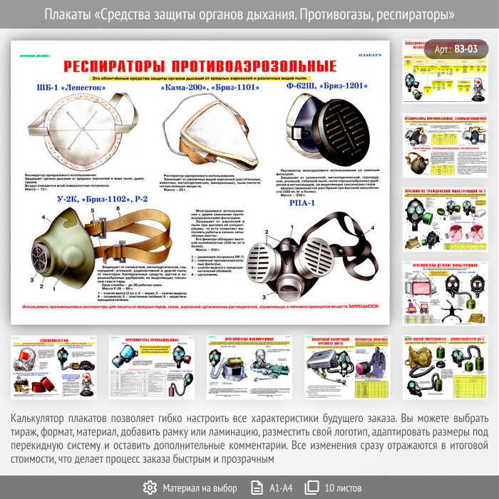 Плакаты «Средства защиты органов дыхания. Противогазы, респираторы» (ВЗ-03, 10 листов) в Бердске купить
