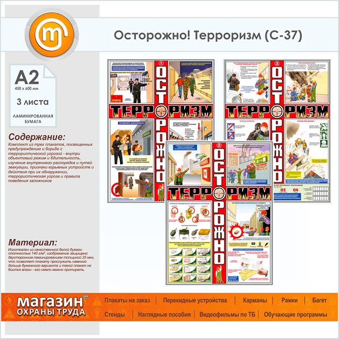 Плакаты «Осторожно! Терроризм» (С-37, ламинированная бумага, А2, 3 листа) в Бердске купить