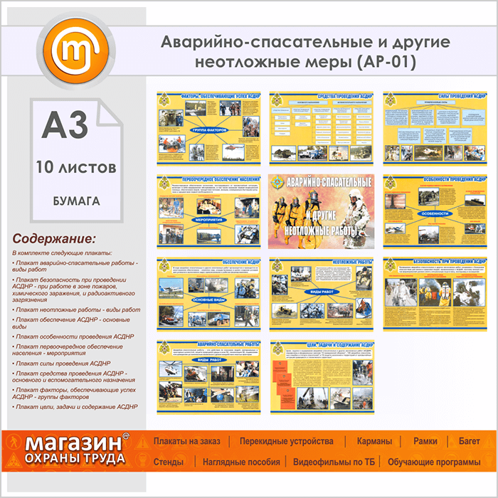 Плакаты «Аварийно-спасательные и другие неотложные меры» (АР-01, бумага, А3, 10 листов) в Бердске купить