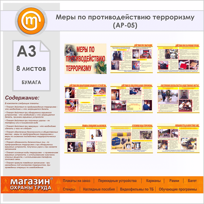 Плакаты «Меры по противодействию терроризму» (АР-05, бумага, А3, 8 листов) в Бердске купить