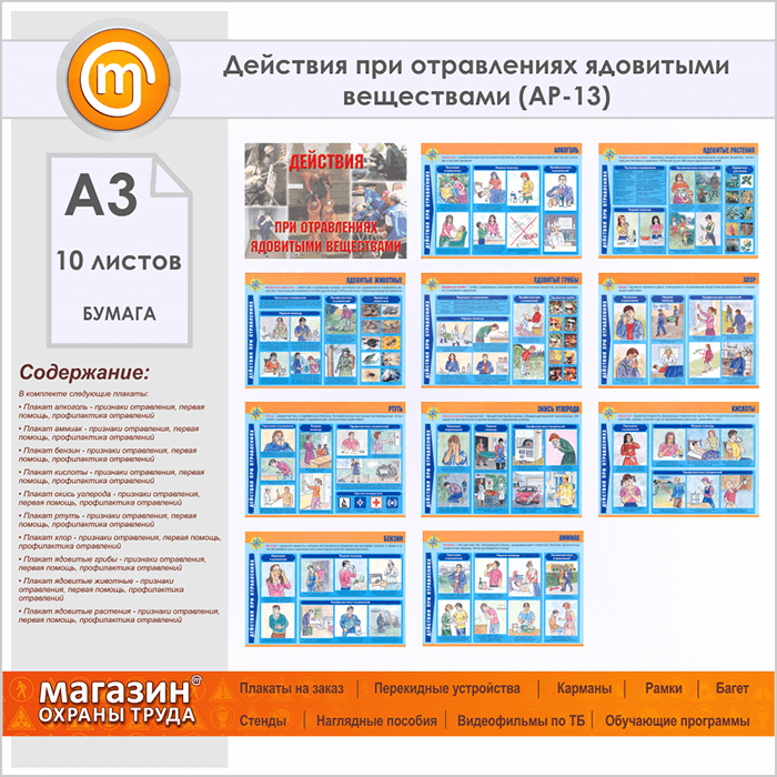 Плакаты «Действия при отравлениях ядовитыми веществами» (АР-13, бумага, А3, 10 листов) в Бердске купить