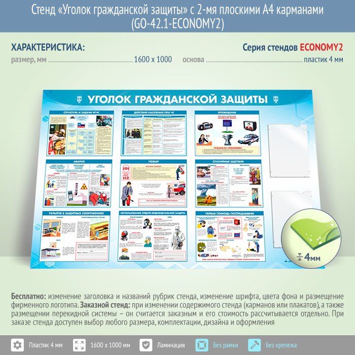 Стенд «Уголок гражданской защиты» с 2-мя плоскими А4 карманами (GO-42.1-ECONOMY2) в Бердске купить