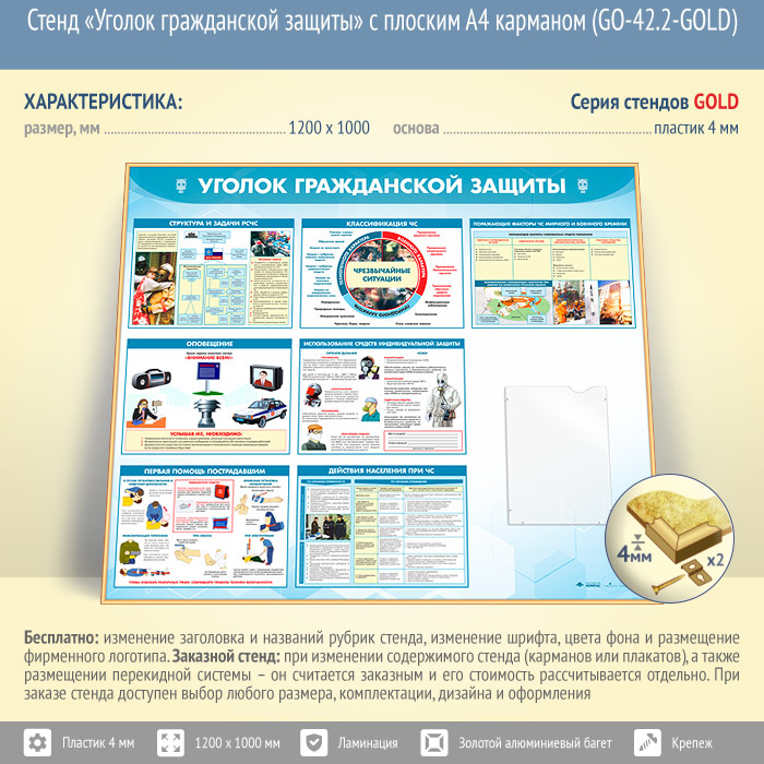 Стенд «Уголок гражданской защиты» с плоским А4 карманом (GO-42.2-GOLD) в Бердске купить