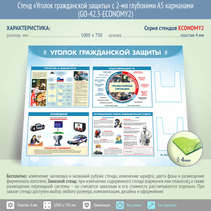 Стенд «Уголок гражданской защиты» с 2-мя глубокими А5 карманами (GO-42.3-ECONOMY2) в Бердске купить