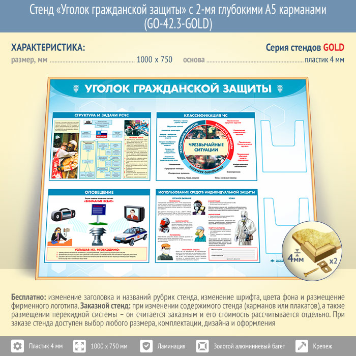 Стенд «Уголок гражданской защиты» с 2-мя глубокими А5 карманами (GO-42.3-GOLD) в Бердске купить