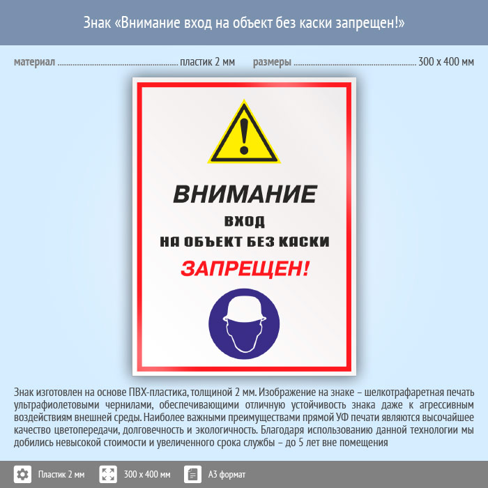 Знак «Внимание вход на объект без каски запрещен!», КЗ-13 (пластик, 300х400 мм) в Бердске купить