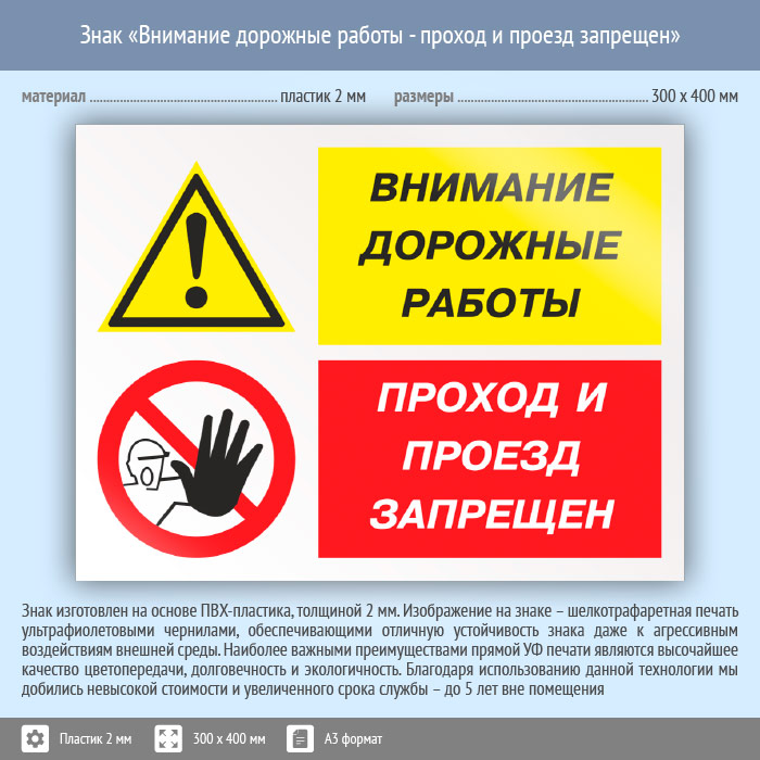 Знак «Внимание дорожные работы - проход и проезд запрещен», КЗ-14 (пластик, 400х300 мм) в Бердске купить