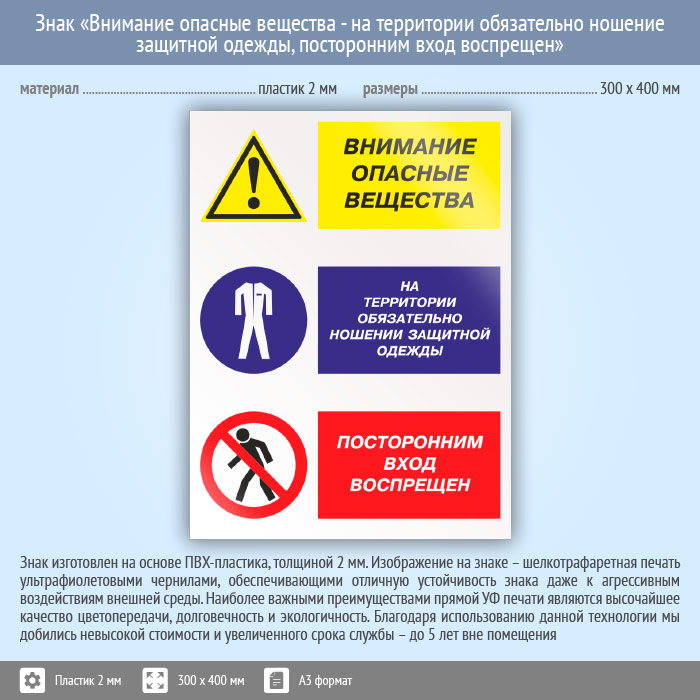 Знак «Внимание опасные вещества - на территории обязательно ношение защитной одежды, посторонним вход воспрещен», КЗ-15 (пластик, 300х400 мм) в Бердске купить