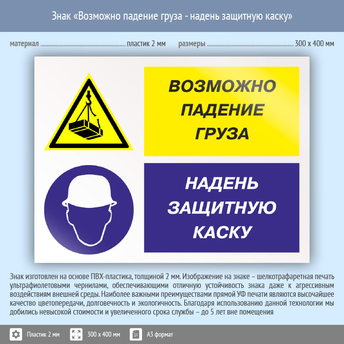 Знак «Возможно падение груза - надень защитную каску», КЗ-17 (пластик, 400х300 мм) в Бердске купить