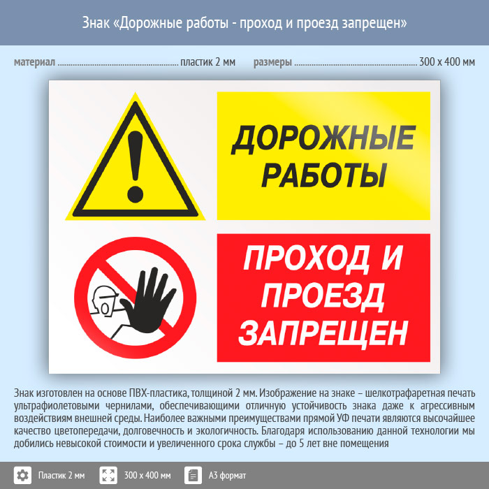 Знак «Дорожные работы - проход и проезд запрещен», КЗ-20 (пластик, 400х300 мм) в Бердске купить