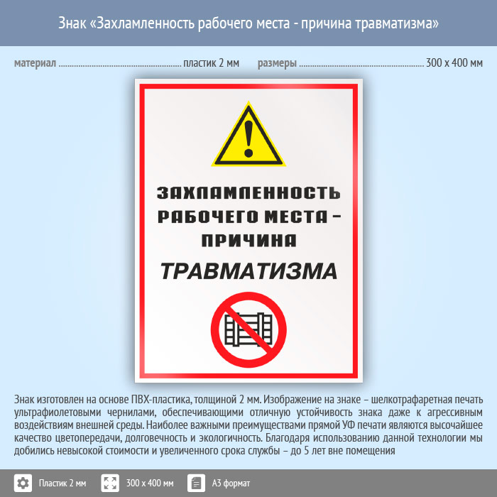 Знак «Захламленность рабочего места - причина травматизма», КЗ-21 (пластик, 300х400 мм) в Бердске купить