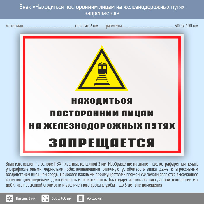 Знак «Находиться посторонним лицам на железнодорожных путях запрещается», КЗ-24 (пластик, 400х300 мм) в Бердске купить