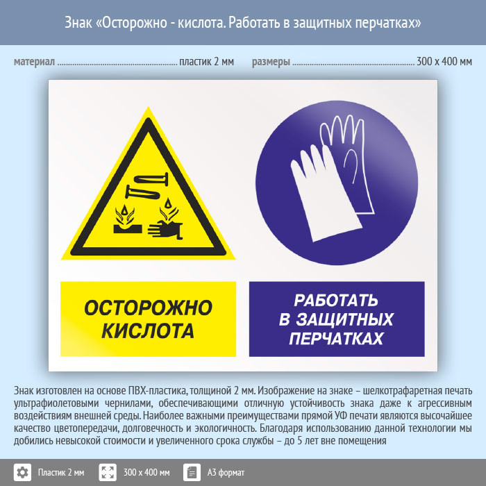 Знак «Осторожно - кислота. Работать в защитных перчатках», КЗ-56 (пластик, 400х300 мм) в Бердске купить