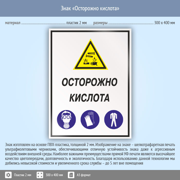 Знак «Осторожно кислота», КЗ-61 (пластик, 300х400 мм) в Бердске купить