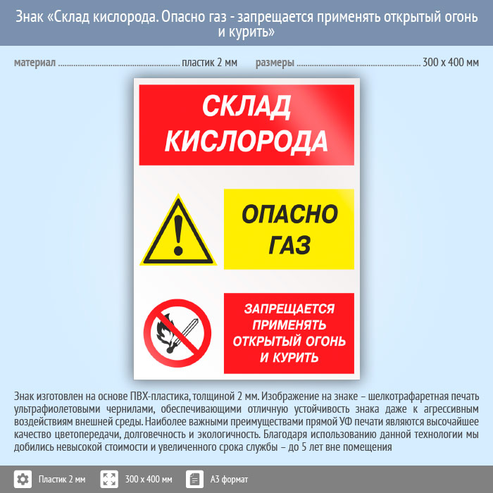 Знак «Склад кислорода. Опасно газ - запрещается применять открытый огонь и курить», КЗ-85 (пластик, 300х400 мм) в Бердске купить
