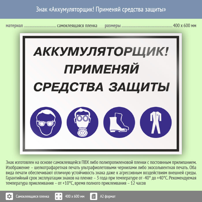 Знак «Аккумуляторщик! Применяй средства защиты», КЗ-02 (пленка, 600х400 мм) в Бердске купить