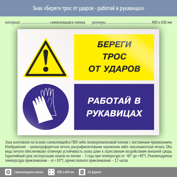 Знак «Береги трос от ударов - работай в рукавицах», КЗ-03 (пленка, 600х400 мм) в Бердске купить