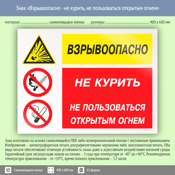 Знак «Взрывоопасно - не курить, не пользоваться открытым огнем», КЗ-05 (пленка, 600х400 мм) в Бердске купить