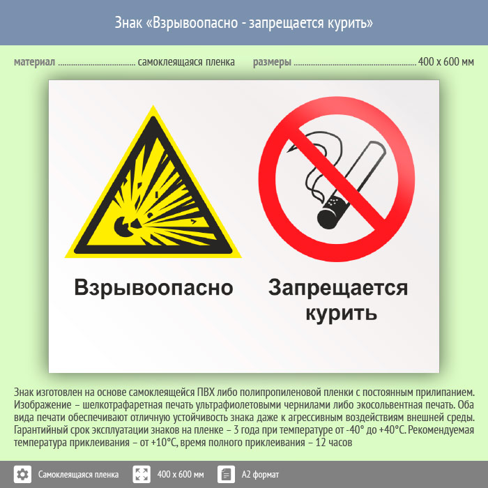 Знак «Взрывоопасно - запрещается курить», КЗ-06 (пленка, 600х400 мм) в Бердске купить